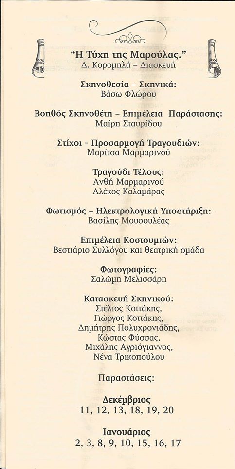 Το Σάββατο 2/1/2016 λίγο πριν από την θεατρική παράσταση "Η τύχη της Μαρούλας" τα μέλη του θεατρικού τμήματος έκοψαν την πίτα τους.Η τυχερή ήταν η Νένα Τρικοπούλου .